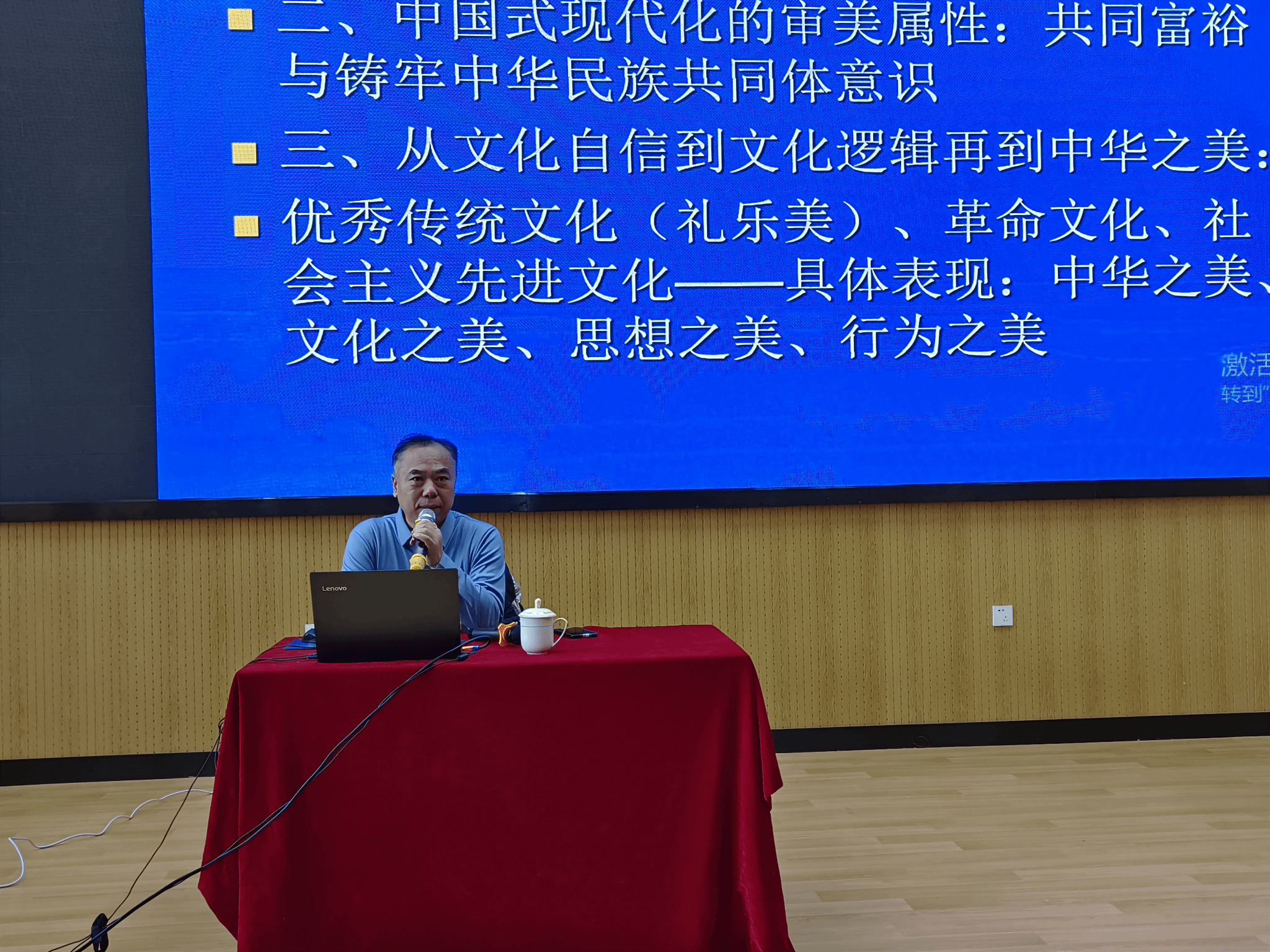 王建成从学校美育工作的重要性和紧迫性讲起,谈到习近平总书记对学校美育工作作出的重要指示和教育部出台的《关于全面实施学校美育浸润行动的通知》不仅体现了国家对学校美育工作的高度重视,也为做好美育工作指明了方向,认为它对构建高校支持中小学美育协同发展机制、促进学校美育工作开展具有重要意义和独特价值。讲座中,王教授着重分析了中国式现代化的内涵、中国式现代化的审美属性,并从文化自信到文化逻辑再到中华之美详细论述了中国式现代化应该包括人的精神现代化,分析了精神之美、语言之美、行为之美、风度之美应是中国式现代化的应有之义。
