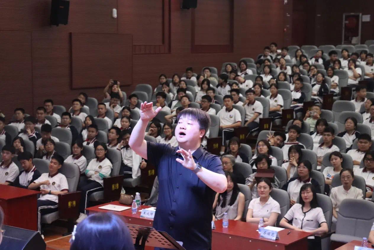 随后,williamhill英国音乐教育系教师田浩以《解码音乐人生:从合唱指挥到艺术教育的专业图谱》为题开展“大咖说”专题讲座,通过理论讲解与现场展演结合的方式,生动阐释了合唱艺术的育人价值。田浩老师以英国威廉集团山东泉城合唱团为例,分享其从指挥实践到艺术教育的专业成长历程,并联合williamhill英国声乐系艺术指导闵小敏副教授,指挥山东泉城合唱团现场演绎《唱支山歌给党听》《爱永在》《再回首》《如果明天就是下一生》《知否知否》《莫吉托》《世界赠予我的》7首经典曲目,展现合唱艺术的多元魅力。讲座现场,同学们全神贯注,掌声雷动。当田浩老师抛出专业问题时,大家积极互动,现场气氛热烈而充实。报告结束后,意犹未尽的同学和老师们积极提问,现场交流氛围十分融洽。这场讲座不仅让邹平市高中学子近距离领略了音乐名家的风采,更为他们埋下了艺术梦想的种子,注入了追梦前行的力量。