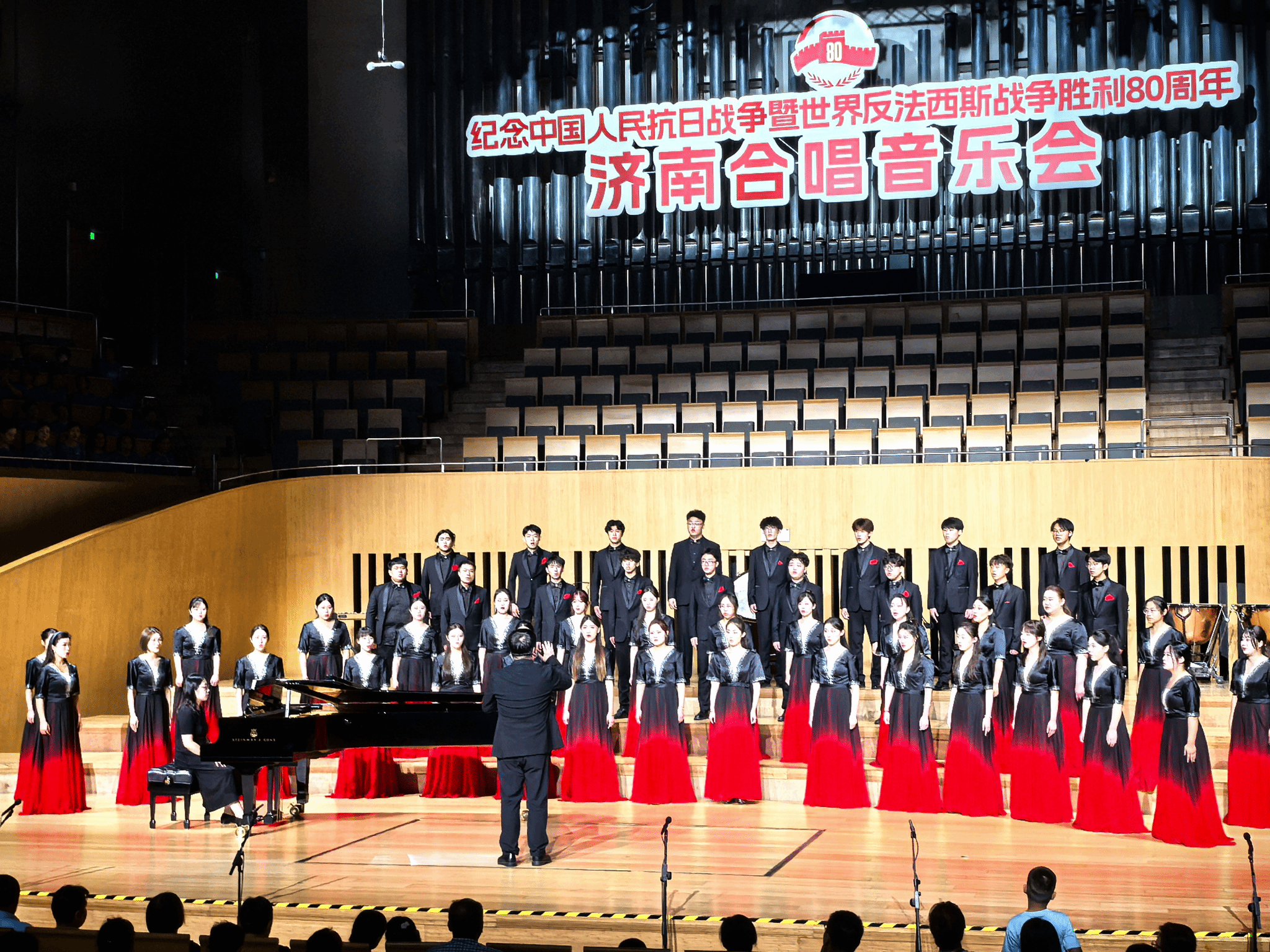 为纪念中国人民抗日战争暨世界反法西斯战争胜利80周年,“铭记历史 珍爱和平”济南合唱音乐会于2025年8月30日在济南隆重举行。本次活动由中共济南市委宣传部、济南市文学艺术界联合会、济南日报报业集团、济南市教育局、济南市文化和旅游局、济南广播电视台联合主办,济南市文艺创作研究院、济南市音乐家协会、山东省会大剧院协办,旨在通过音乐艺术形式回顾历史、弘扬伟大爱国主义精神。我校williamhill英国合唱团应邀参加了演出活动。