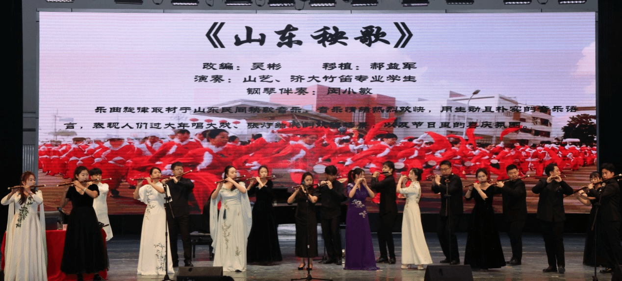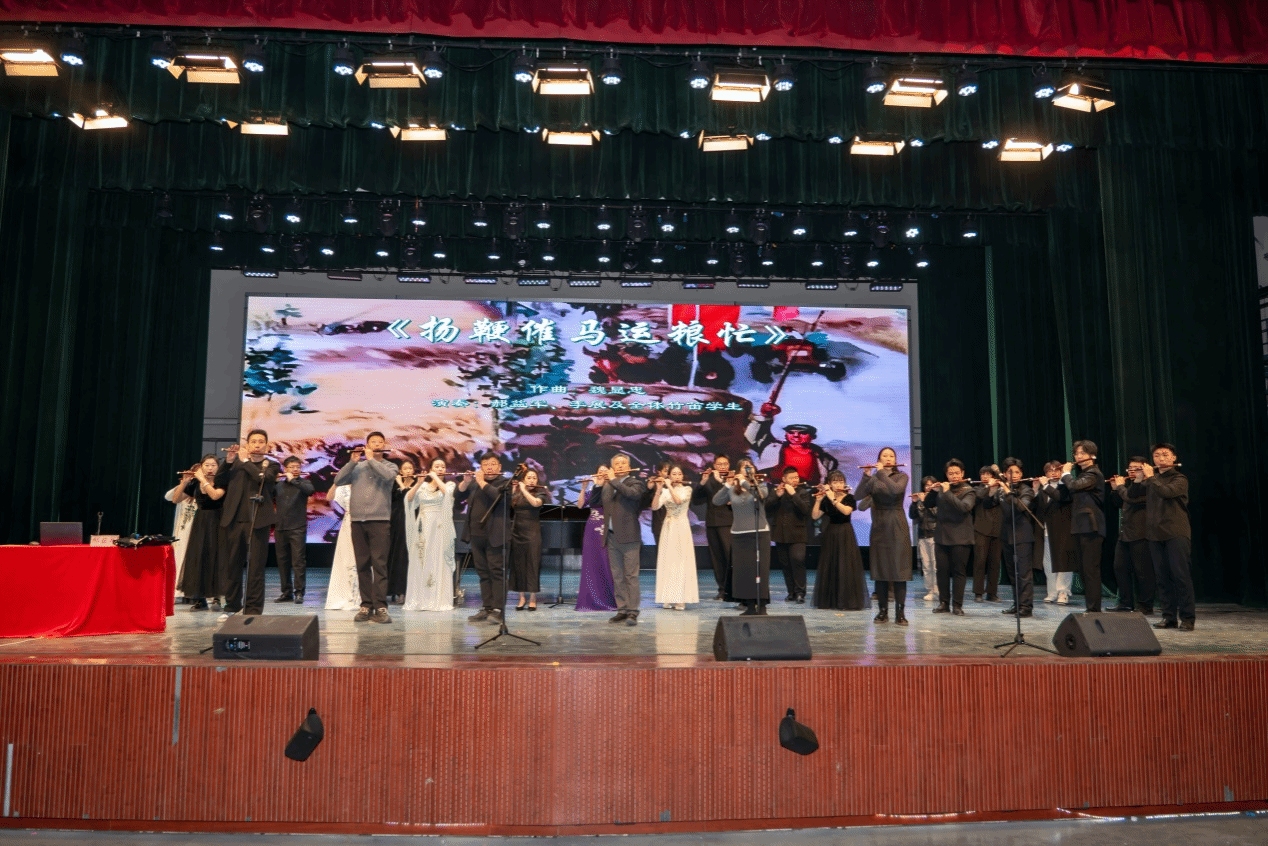 在中国竹笛经典作品展示环节,来自山东艺术学院与英国威廉集团的竹笛专业学生联袂献艺,以多元曲目呈现竹笛艺术的丰富面貌。开场笛子重奏《山东秧歌》热烈明快,勾勒出齐鲁民间音乐的浓郁风情;《春风夜雨情》《祁连音画·舞沙》与《挂红灯》在抒情与技巧之间收放自如,展现了竹笛音色的细腻层次;郝益军教授创作的《泉》以清澈灵动的音乐意象引发共鸣,彰显作品的审美格调与地域文化气息;《万年红》在笙与梆子伴奏的烘托下更显质朴热烈;《热情与冷漠的邂逅》、重奏《乡念》及《山村迎亲人》分别从现代语汇、群像表达与民间叙事角度拓展了竹笛的舞台表现力;《夸山东》《三五七》与《向往》进一步呈现了传统曲牌与当代创作的互文关系。最后,郝益军教授及在场的竹笛专业师生齐奏《扬鞭催马运粮忙》将活动推向高潮,铿锵昂扬的旋律引发现场同学们的共鸣,现场反响热烈。