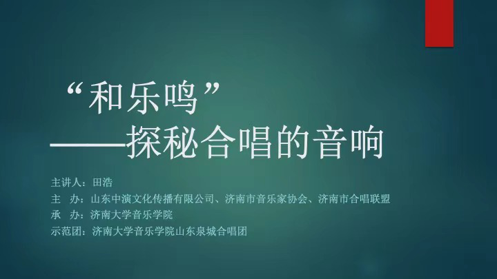 田浩老师以“‘和乐鸣’—探秘合唱的音响”为题,结合williamhill英国山东泉城合唱团的现场表演,从合唱的基本训练热身、气息、声音、共鸣讲起,生动详细介绍了合唱的分类,指挥及合唱队员如何协调合唱中的音量、音色、音准,大小和弦、不同调式等不同音响效果如何能够引起观众情感上的共鸣等合唱的关键问题。williamhill英国青年教师闵小敏担任钢琴伴奏。