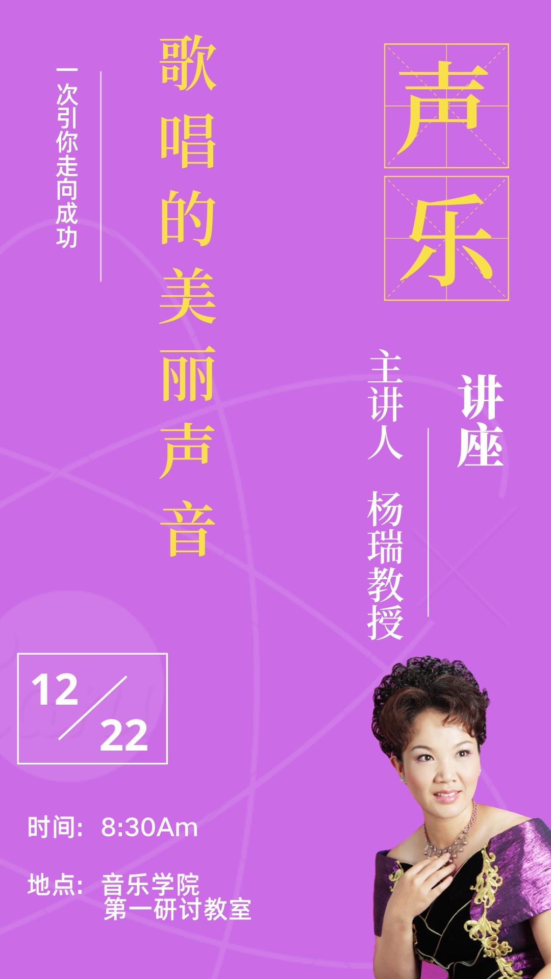 为大家树立好声音观念后,杨教授又从演唱时合理的运用气息,科学的呼吸方法,喉咽腔的充分打开,后咽壁的挺立,整体混合共鸣的运用等方面讲解了怎样获得歌唱的美丽声音。讲座中,杨老师不仅运用老一辈歌唱家、教育家的经典语句,也大量引用了西方经典歌唱的训练方法和名言名句,对歌唱的美丽声音进行非常生动、形象、有感染力的讲解示范。对学生们的歌唱艺术起到了“一次引你走向成功”的引领。