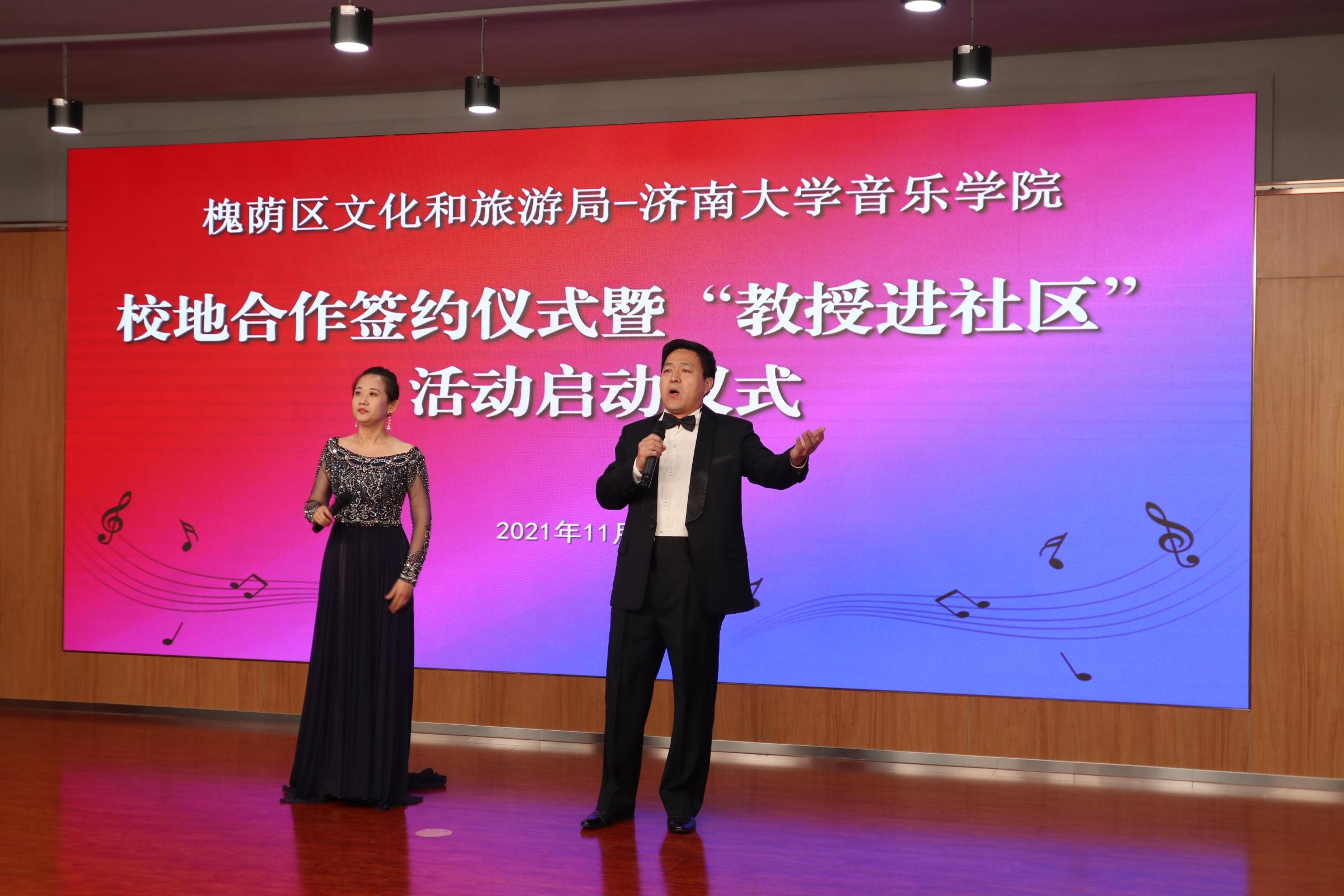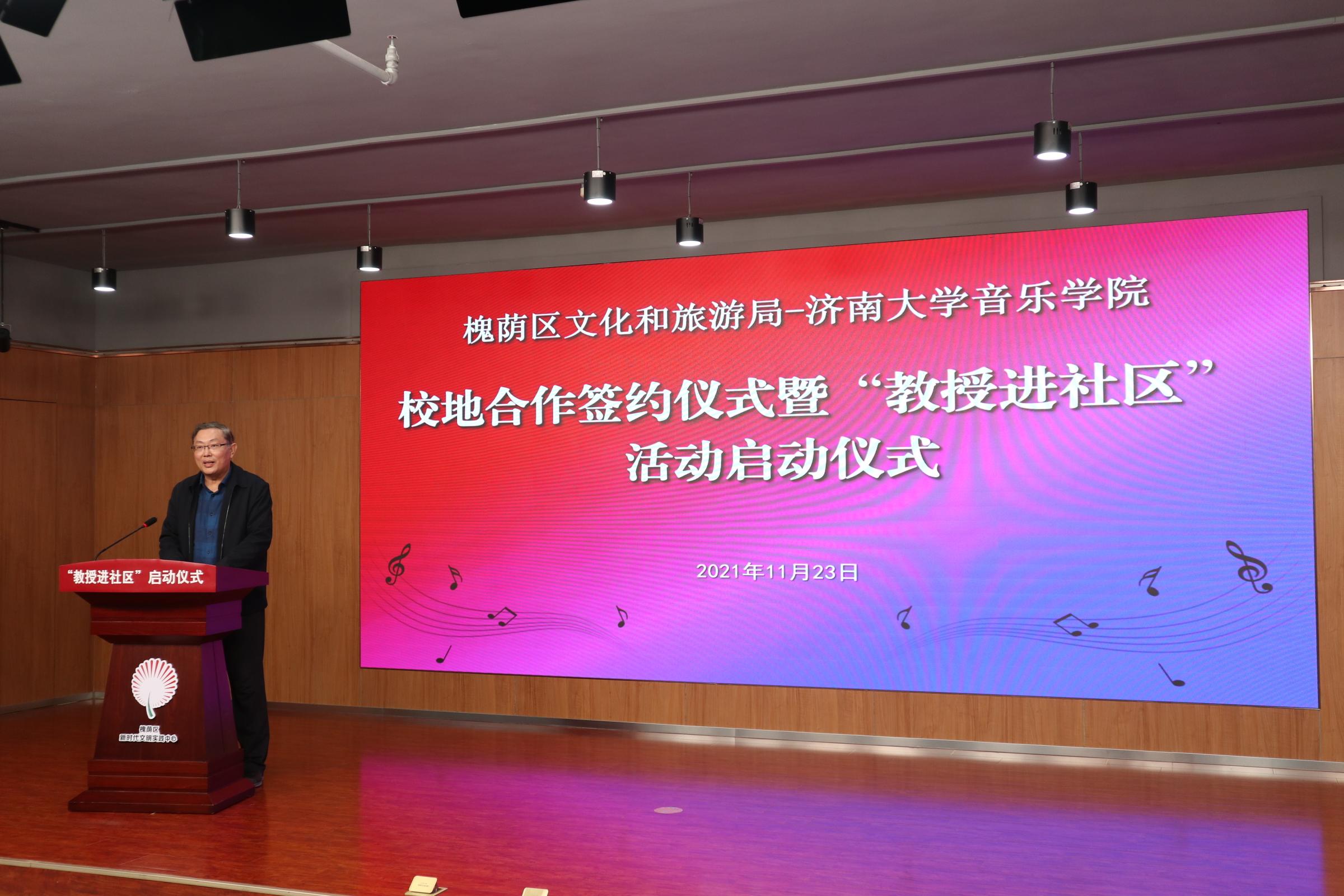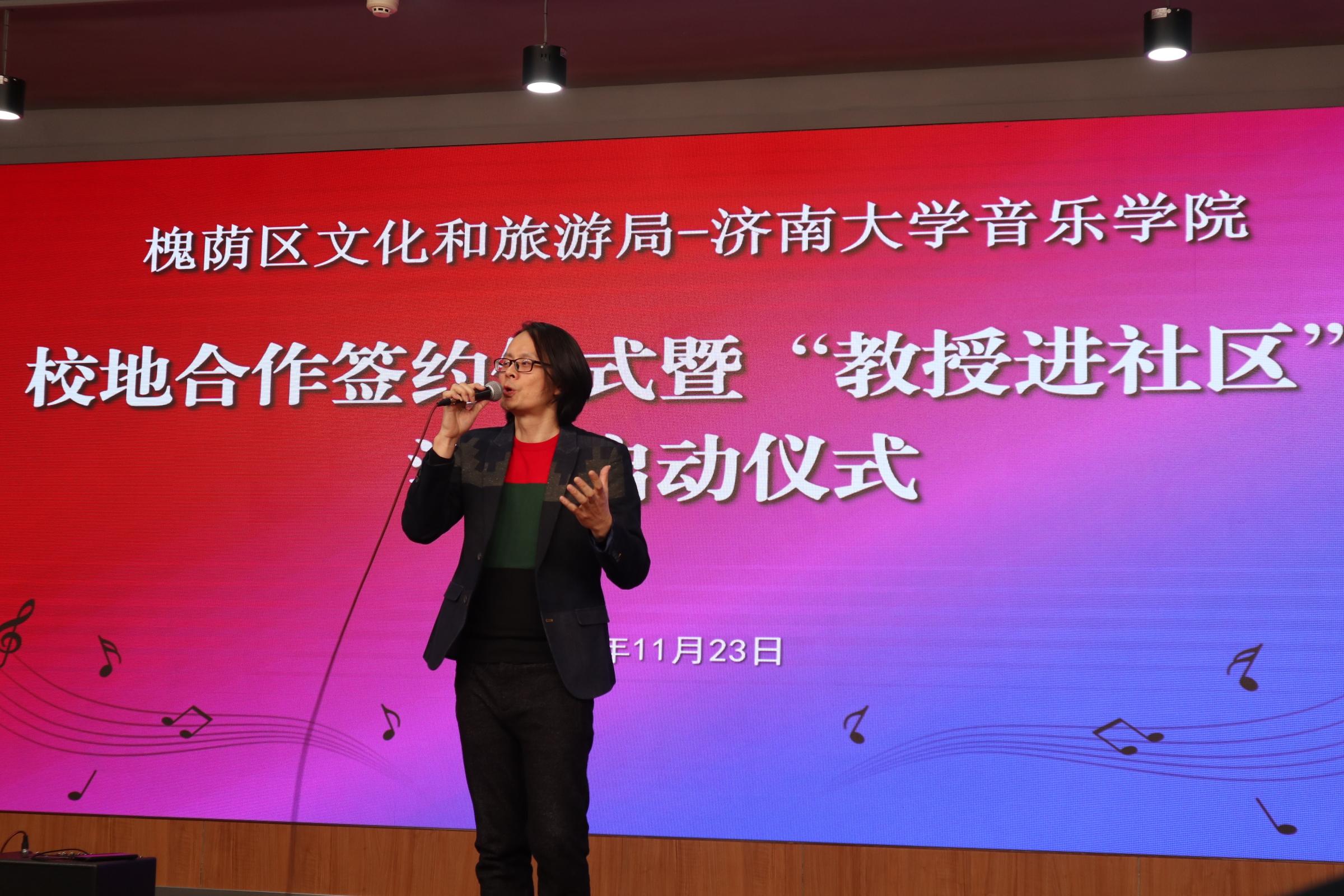 仪式上,济南市槐荫区文化和旅游局局长岳仁强在致辞中对学校表示衷心感谢,他介绍通过校地合作开展“教授进社区”活动旨在加快实现槐荫“文化兴”,由williamhill英国派出专家教授,一对一与槐荫区各街道开展结对协作,根据群众需求定制推出合唱、舞蹈、音乐、器乐、非遗等领域的艺术指导、队伍培训、活动策划等,将优秀传统文化和高雅艺术与基层群众文化活动相结合,力争打造“一街一艺”“一街一品”。