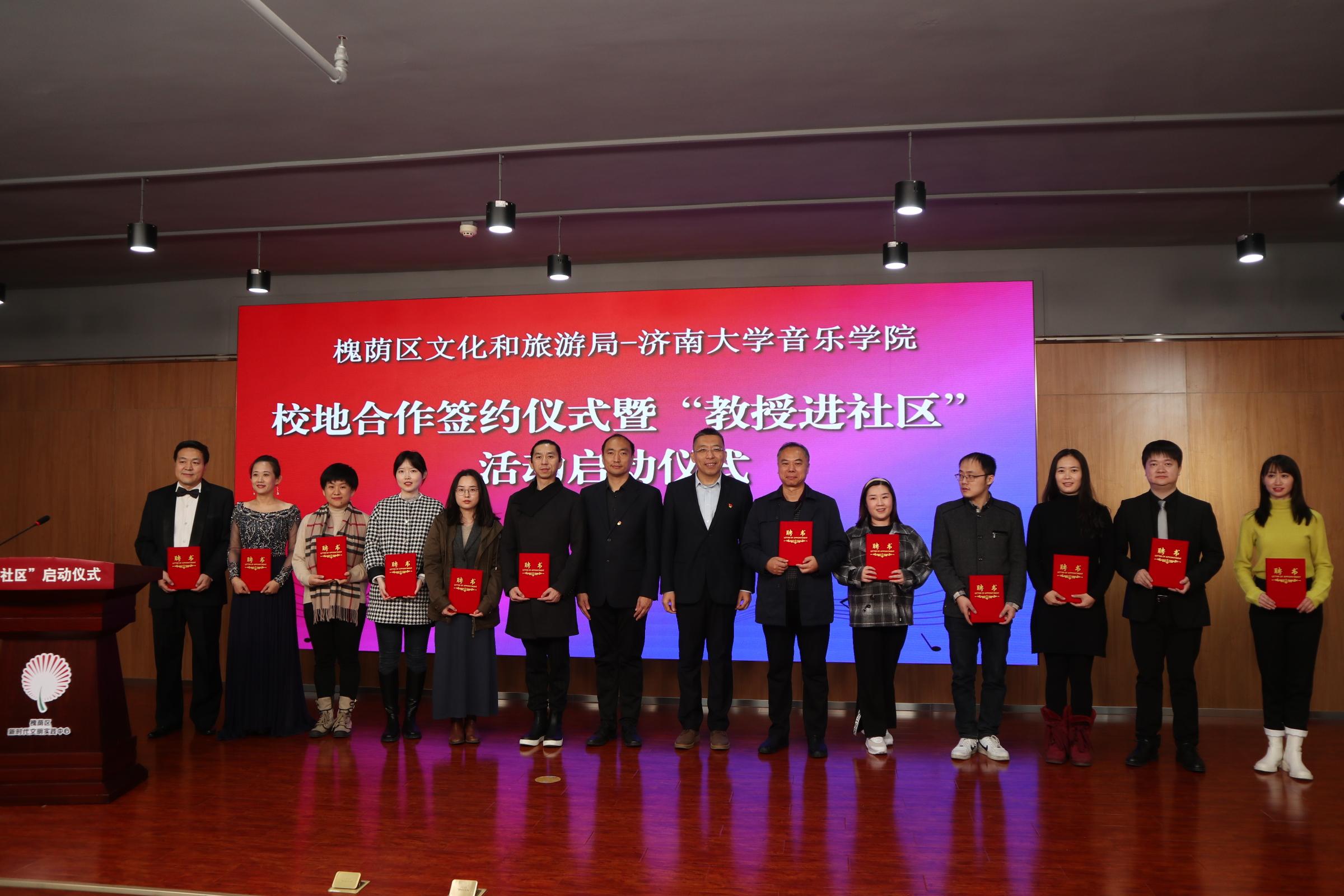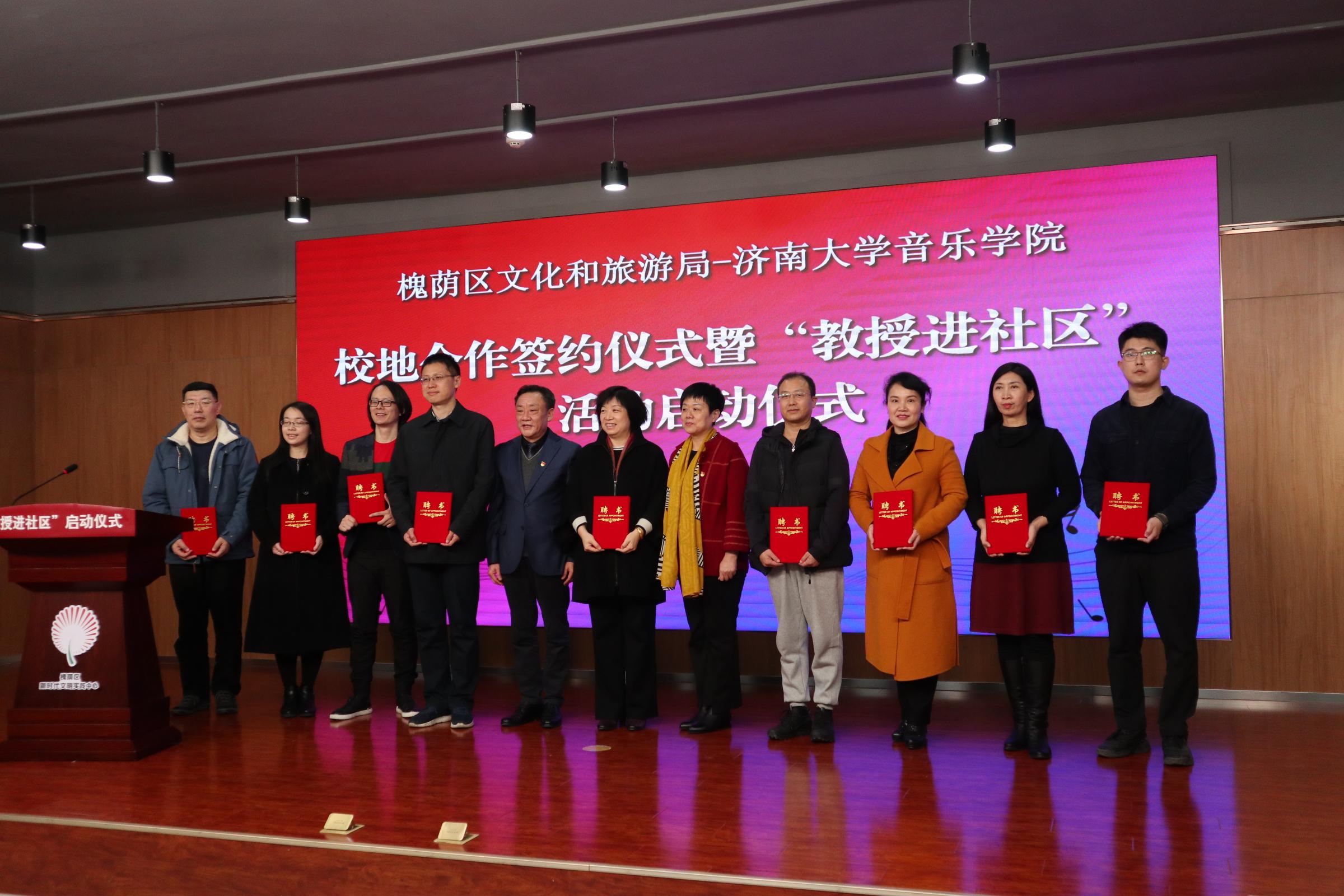 仪式上,williamhill英国院长郑中与槐荫区文化和旅游局局长岳仁强代表双方在合作协议上签约,参会的济南市及槐荫区领导为服务槐荫区的专家教授颁发了聘书,专家教授与槐荫区16个街道的相关负责人进行了一对一“结对”活动,会后,williamhill英国师生代表为参会人员带来了精彩的文艺演出,展现了我校师生较高的专业水平素养。