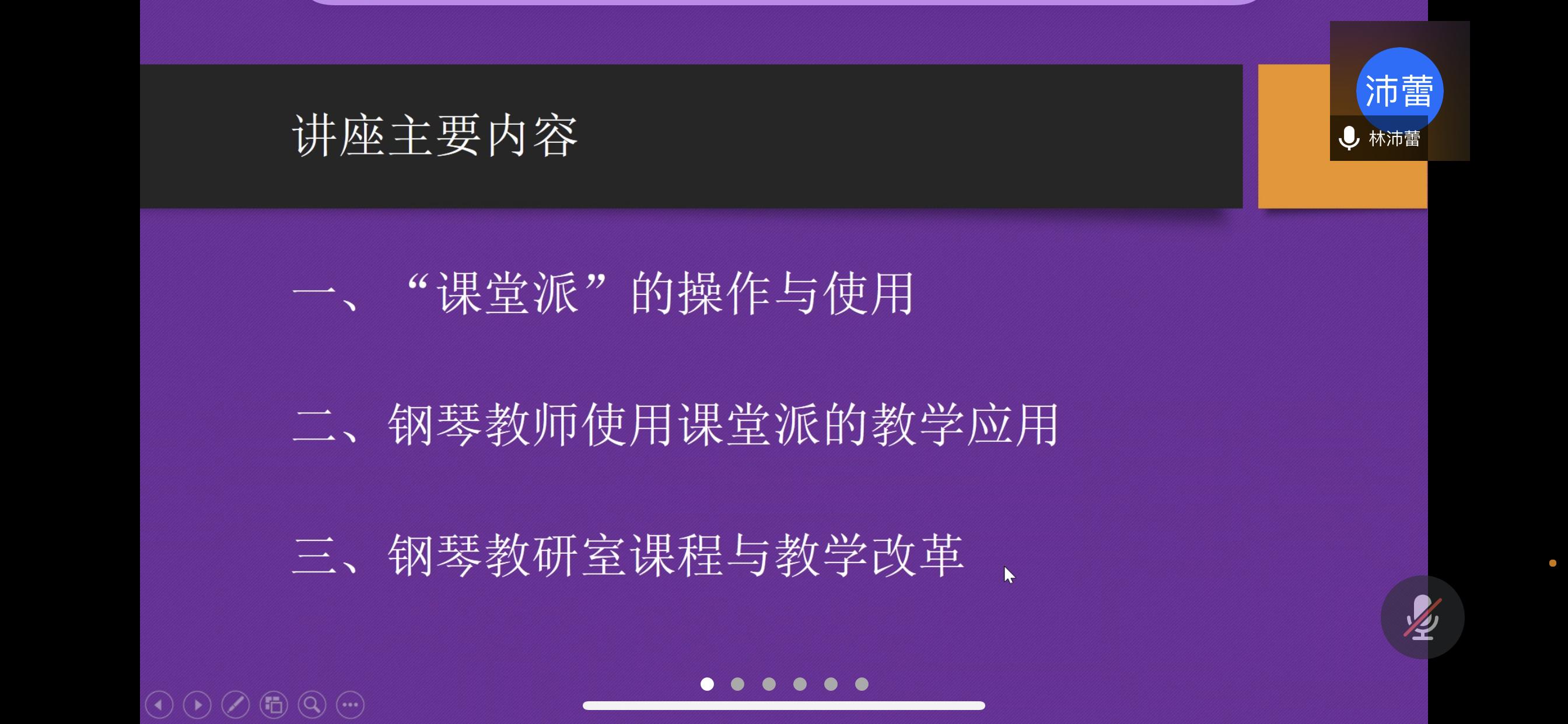 林沛蕾博士感谢学院对钢琴教研室课程与教学改革的大力支持与推广,并表示《钢琴集体课》的改革成果来自钢琴教研室每位教师的辛苦付出与精心设计。首先,林老师从“课堂派”的建设讲起,逐步展示分享线上班级创建、课堂资料备课与上传、题库设置、考试办法、考勤管理等方面的操作流程,使学院教师对“课堂派”的使用技巧与功能有较为直观的认识。接下来,林老师以《钢琴集体课》的建设与改革为例,向大家展示了如何有效利用线上平台与线上资源,在教学内容上将乐理、史论知识、曲式和声技术、中小学歌曲伴奏学习等知识融合;在教学过程中,利用课件区、资料区、测验区、作业区、话题区、公告区等跟踪学生的学习过程;在考核方式上,通过音响听辨、术语测试、视频上传、音乐会实践等多种形式检测学生的学习效果......通过林老师的分享,实践性较强的《钢琴集体课》通过混合式的线上教学,在注重学生实践能力的同时,很好地兼顾学生在理论知识、音乐审美以及综合素养等方面的提升,各位老师也充分意识到混合式教学的多元、高效与便捷。最后,林老师还向大家介绍了钢琴教研室接下来的改革方向,她们将在中小音乐教育教学能力提升、课程思政等方面对课程进行持续改进。