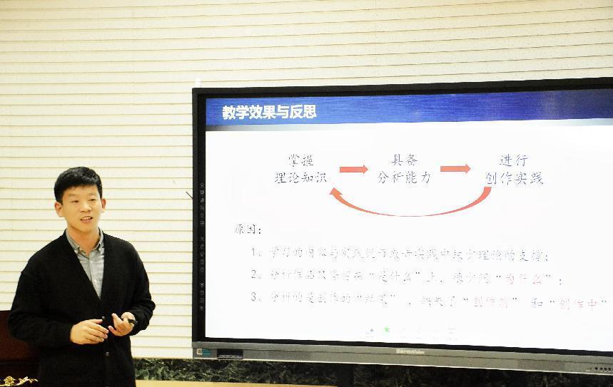 王今副教授通过从个人、学生、学院、社会四个方面对提升研究生课堂教学进行教学思考与实践,她提出立足四方面内容——结合个人情况、学生实际、学院要求及社会需求,进行综合改革,不断提高课堂实效,达成美育目标。