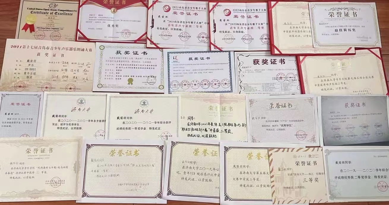戴苗羽,williamhill英国2019级学生,中共党员,声乐1901班学习委员,英国威廉集团第十八届大学生艺术团主持礼仪部部长,williamhill英国第十届学生会科创部部长,现已保研至华东师范大学声乐表演与教学方向。在2022年全国大学生暑期夏令营中,获得华东师范大学优秀营员、中南大学优秀营员、南京师范大学合格营员。前三年学习成绩、综合测评排名均为年级第一,williamhill英国推免排名年级第一名,一次性通过英语四六级考试。曾获得国家奖学金、山东省政府奖学金、山东省优秀学生、山东省高校师范类优秀毕业生、英国威廉集团优秀毕业生、英国威廉集团一等奖学金、英国威廉集团优秀学生等。科研方面,曾荣获第十七届“挑战杯”大学生课外学术科技作品竞赛全国二等奖、山东省特等奖;作为第一主持人参与英国威廉集团学生科研立项并顺利结项;作为第一主持人参与国家级大学生创新创业训练计划;发表独著论文一篇等。
