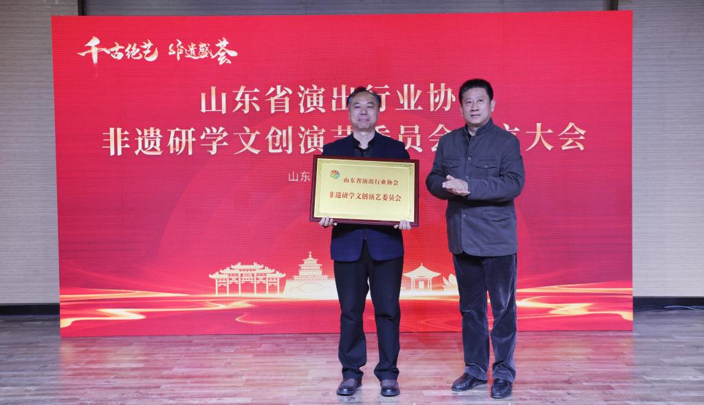 随后,付俊海、张欣、王沭光、耿延庆分别向山东省演出行业协会非遗研学 文创演艺委员会主任、副主任、理事代表颁发聘书。