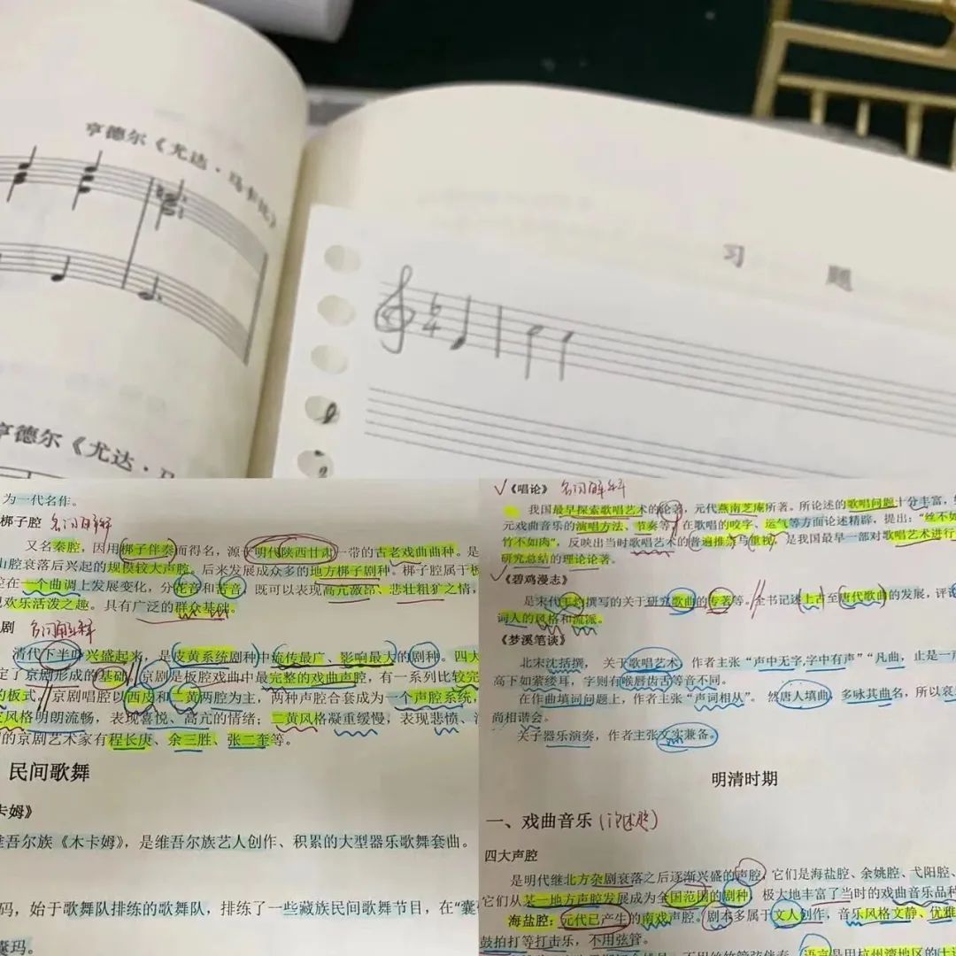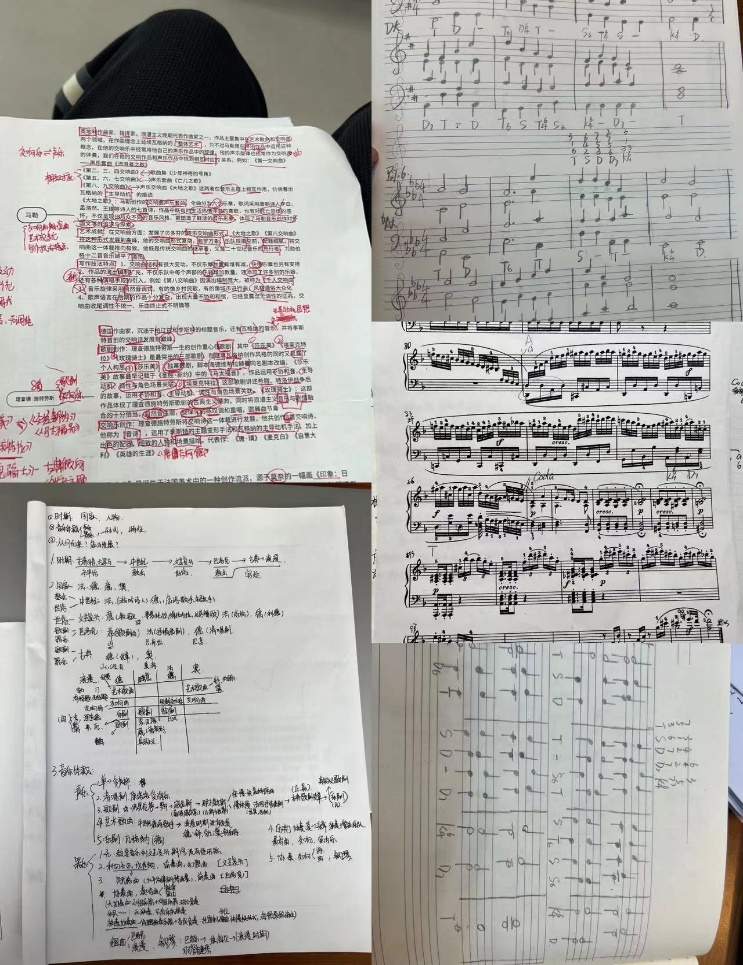 我需要备考的专业课一共有四门,分别是西方音乐史,中国音乐史,曲式分析以及和声写作。音乐史需要大量的背诵,不管是音乐史还是其他文科类专业,都讲究一个理解,理解知识点的缘由,串联成一条线索,自然而然就能背过了。音乐史我反复背诵了六遍,到了后期一定要动手默写,这样到考场上才会有条不紊的将各类知识点呈现到答题纸上。