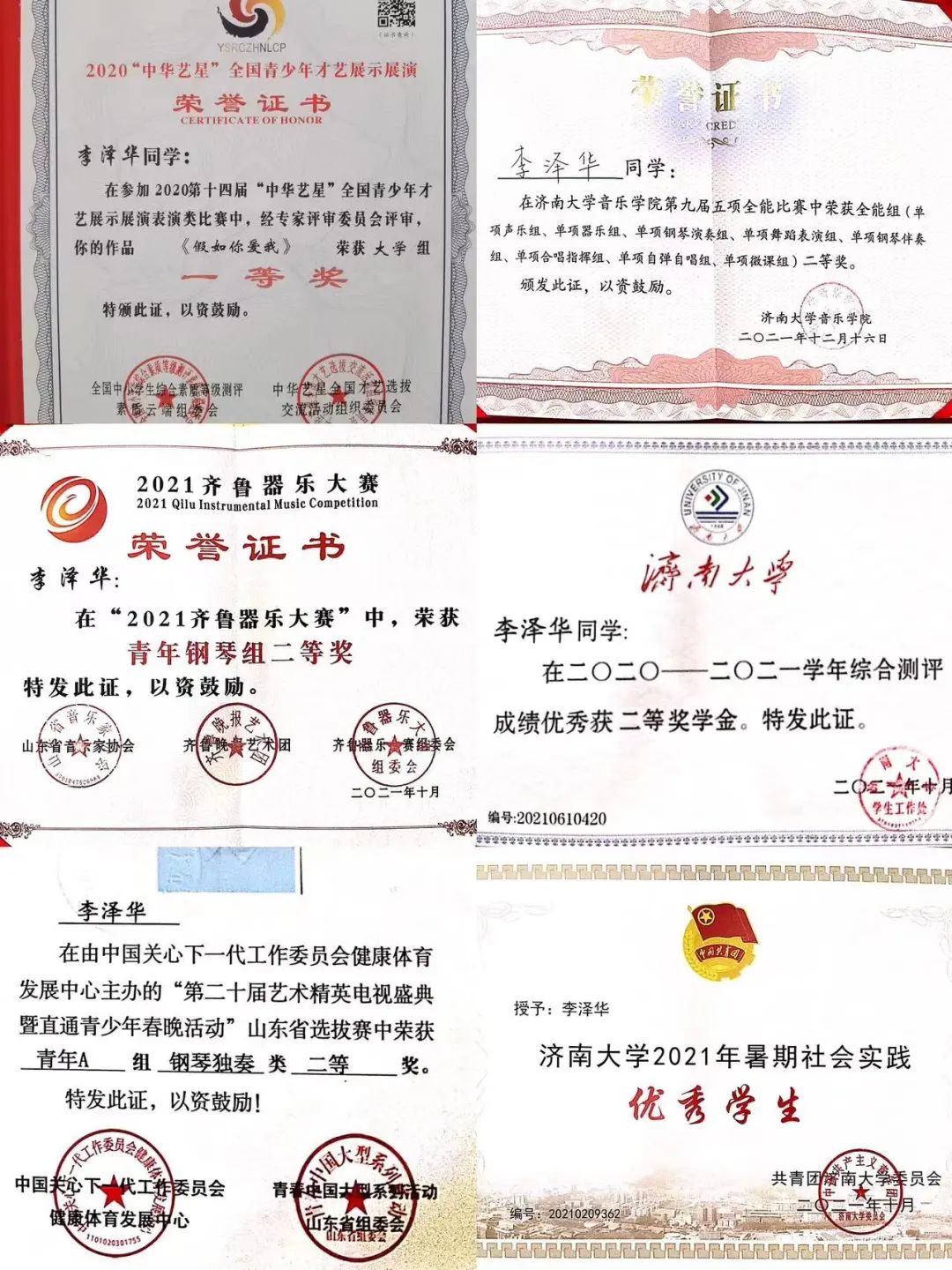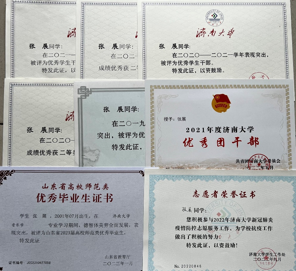 2020—2021学年:获校二等奖学金、英国威廉集团优秀学生干部、山东省大学生合唱艺术节一等奖、齐鲁器乐大赛青年钢琴组二等奖、英国威廉集团暑假社会实践优秀学生