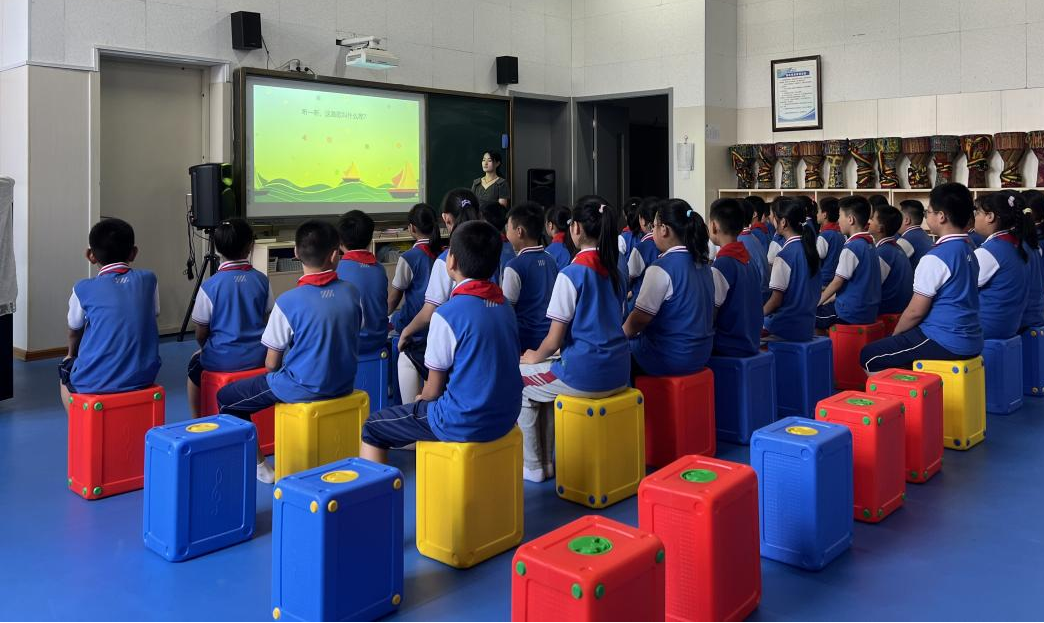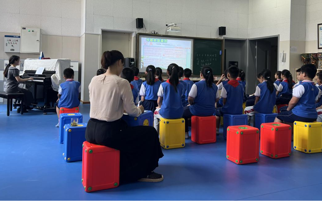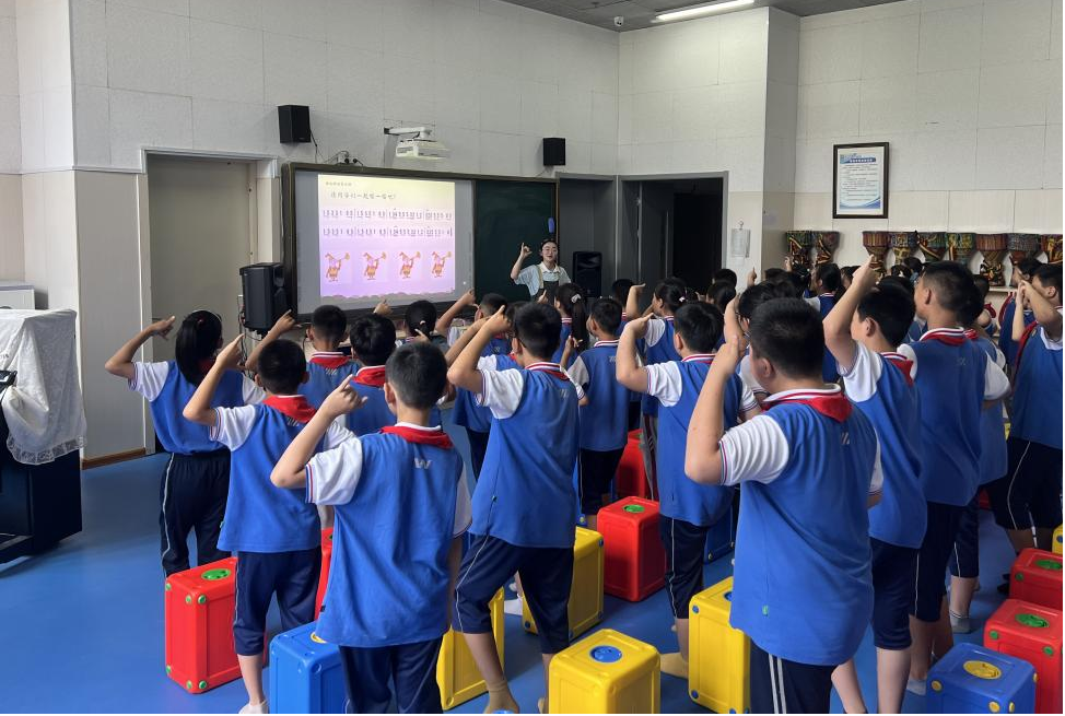 本次活动是以我院学生建立在基础理论的学习之上,进入一线教学环境进行的教学实践,共安排了两节课进行教学。第一节课由器乐2001班张亭亭同学进行五年级课程《外婆的澎湖湾》的讲解,在教学过程中充分运用了在音乐教育学课上学到的“多觉联动”教学方法,发挥动觉、听觉、视觉等多方面的联动效应,使五年级的学生们沉浸在对台湾校园歌曲《外婆的澎湖湾》的学习中。不仅掌握了如何演唱该歌曲,进入了很好的歌唱状态,还通过课程中了解到了台湾澎湖列岛的风土人情。张亭亭同学在歌曲的教学中,让学生们自由想象歌曲中所展现的画面,并且在完成歌曲的教学后,张亭亭同学又带领大家了解了其他几首校园歌曲,向同学们讲述歌曲的演唱者与亲人之间感人的故事,使学生们在本堂课中受益匪浅。