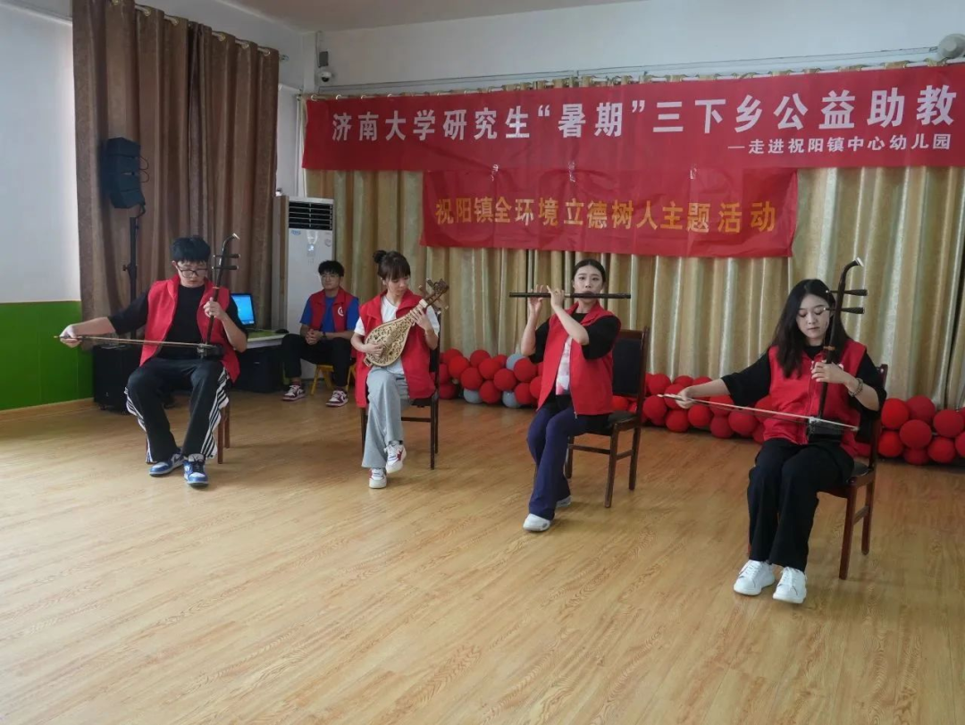 夏日骄阳拦不住青春的热忱,孩子们的笑容如同夏日凉爽的冰棍,将心灵沁的清清凉凉。志愿服务队在与祝阳镇镇政府进行对接之后,来到祝阳镇中心幼儿园,根据园长介绍,同时根据小朋友们的实际情况,志愿服务队制定了适合小朋友们的上课计划。经过与班主任的沟通和学习后,志愿服务队以“课程即游戏”的方式开设了基本乐理、合唱、器乐赏析舞蹈等课程。随着与小朋友们的深入交流与接触,我们不断改进,为小朋友们提供一个有特色、好吸收的趣味课堂,助力幼儿园一班一“特色”,一区一“探索”计划,将乡村文化振兴融入到行动中,不断为美好乡村建设与振兴添砖加瓦。