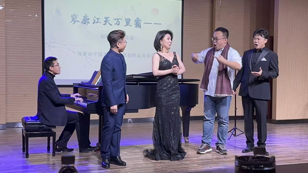 音乐会尾声,著名旅美低男中音歌唱家李鳌教授惊喜亮相,为现场观众带来一曲《幽兰》,其创作源自《周易·中孚卦》中二爻的卦辞:“鹤鸣在阴,其子和之;我有好爵,吾与尔靡之。”李鳌教授出神入化的演唱,将孔子对于“士”之风骨的追求表达的淋漓尽致。整场音乐会以独特的音乐语言讲述了充满感染力与艺术魅力的音乐故事,音韵和谐,旋律优美,使师生们深切感受到了中国原创声乐作品的勃勃生机与深厚内涵。此外,李鳌还对音乐会中的演唱部分进行了详尽的点评,对郑梦雨的原创作品及赵鹏等人的精湛表演给予了高度评价。最终,音乐会在李鳌、赵鹏、徐小亮与白晶袁共同演唱的《踏雪寻梅》中圆满落幕。