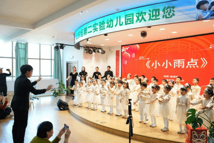 接下来,由山东省第二实验幼儿园爱乐合唱团小朋友们上台表演杯子节奏《爱幼润禾》、《小花开了》、《小小雨点》三首曲目。
