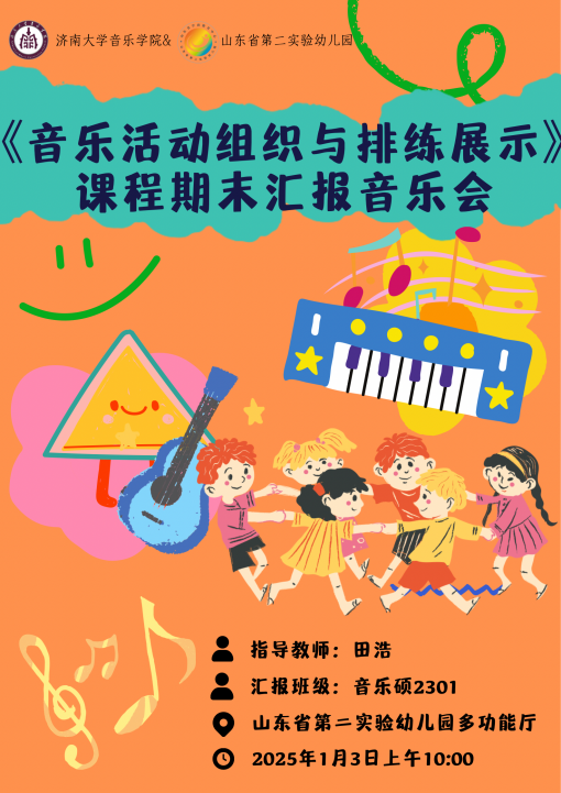 为使我院研究生得到更高质量、更有特色的发展,进一步推动协作类课程与开放型实践课程,在本学期开设的《音乐活动组织与排练展示》课程中,田浩老师带领23级研究生走进山东省第二实验幼儿园进行为期一学期的教学实践,并在2025年1月3日联合山东省第二实验幼儿园成功举办课程期末汇报音乐会,williamhill英国副院长齐丽花老师、音教系副主任林沛蕾老师和孙人君老师、以及山东省第二实验幼儿园岳艳园长莅临此次音乐会指导,并给予了本次音乐会以及学生们高度的肯定。