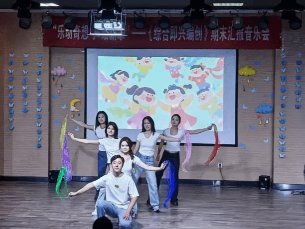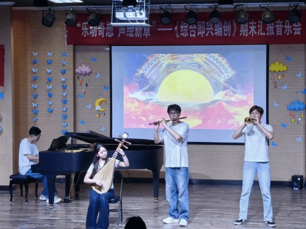 本场音乐会依托全国艺术专业学位研究生教育指导委员会于2022年4月公布的“艺术硕士音乐教育方向研究生协作类核心示例课程:《综合即兴编创》(艺教指委[2022]4号)”,进行课程建设成果汇报,课程负责人为音乐教育系副主任林沛蕾老师。本次音乐会的举办方式与传统模式有所不同,融入了人工智能技术辅助的短视频创作、趣味性采访拍摄以及多媒体元素的穿插,赋予了音乐会更多的趣味性和创新精神。从音乐会的策划、节目编排、排练、调整直至幕后工作,均由学生团队在教师指导下独立完成,这一过程充分体现了“翻转课堂”教学理念的实践。自课程建设以来的两年多时间里,学生们积极利用音乐教育与电子音乐专业的特长,将音乐理论与实践紧密结合,致力于探索符合新课程标准的音乐教育新路径。