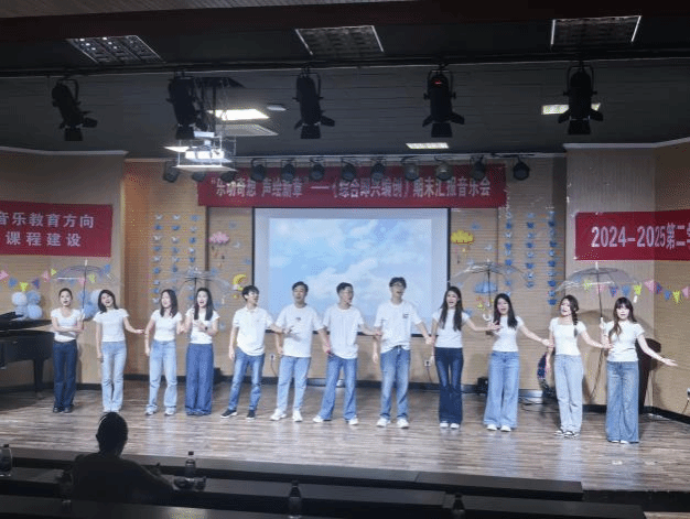 本场音乐会通过四个不同的篇章,有如微电影一般的方式呈现各个节目,带领观众踏上了一段奇幻的音乐之旅。序幕以AI软件制作的配乐搭配音乐硕2301全体同学的排练场景的花絮为整场音乐会奠定了前沿的基调,歌词富有巧思,融入了各节目的名称。进入篇章一“童趣初绽”,杯子舞《本草纲目》+《最炫民族风》以奥尔夫声势为基础,在其轻快的音乐下设计不同节奏的杯子动作,加入音乐动作设计形成多声部互动的概念。“身体打击乐”串烧节目挑选了三首不同风格的中小学音乐课本歌曲《桔梗谣》《踏雪寻梅》《卡门序曲》,用身体演绎音乐的无限可能。“音乐游戏”串烧节目选择音乐课堂中常见使用的道具彩带、呼啦圈、球、丝巾,通过游戏设计,提升对音乐的感知力,以及身体的协调性、灵活性和节奏感,通过集体协作,展现音乐游戏在音乐课堂中运用的独特魅力和艺术效果。《山鬼》三声部合唱改编,以楚辞《山鬼》为基底,展现音乐与文学融合的美妙,感受传统文化在现代艺术形式下的独特魅力,有着跨越时空的情感力量,增强对中华传统文化的认知与情感共鸣。