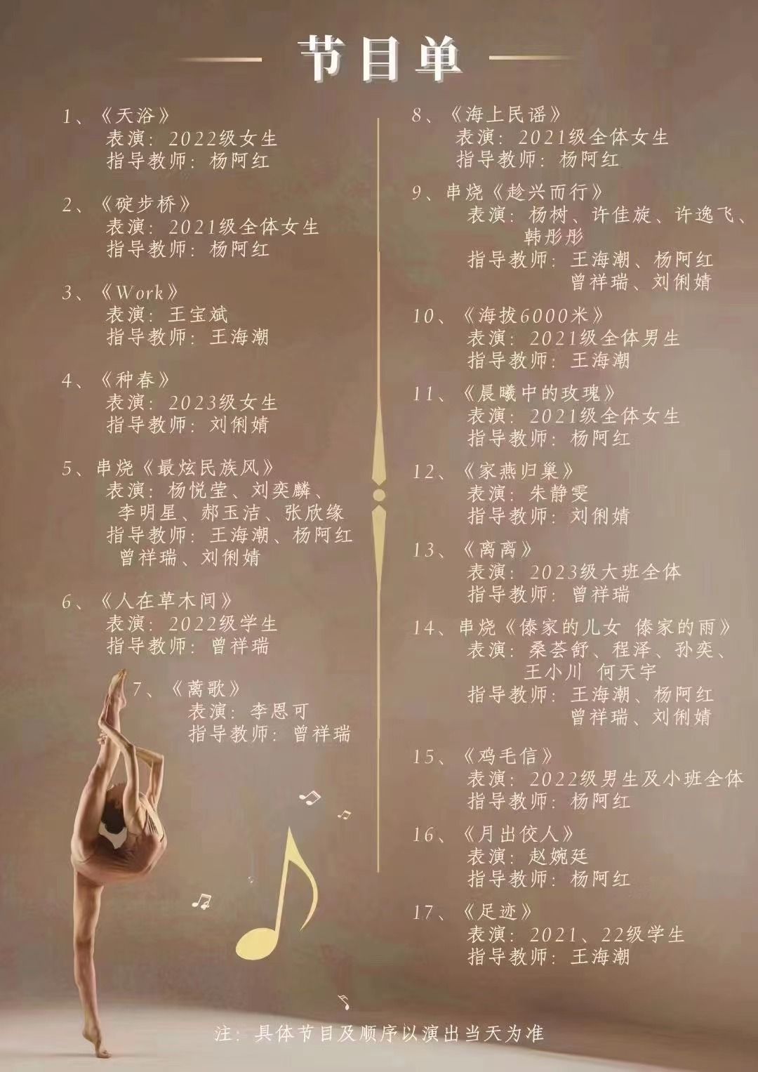 本次晚会呈现了17个精彩节目,涵盖了民族舞、古典舞、现代舞等多种舞蹈形式。晚会不仅展现了舞者们扎实的舞蹈功底和高超的技艺,更通过舞蹈这一独特艺术形式,传递了强烈的艺术表现力和感染力。