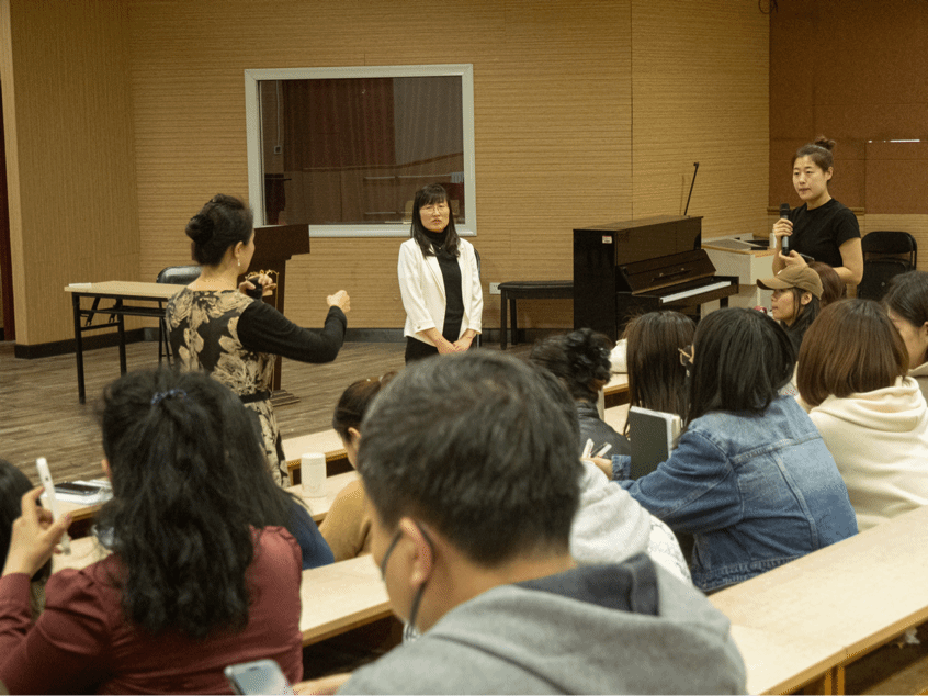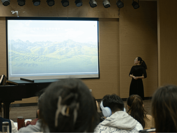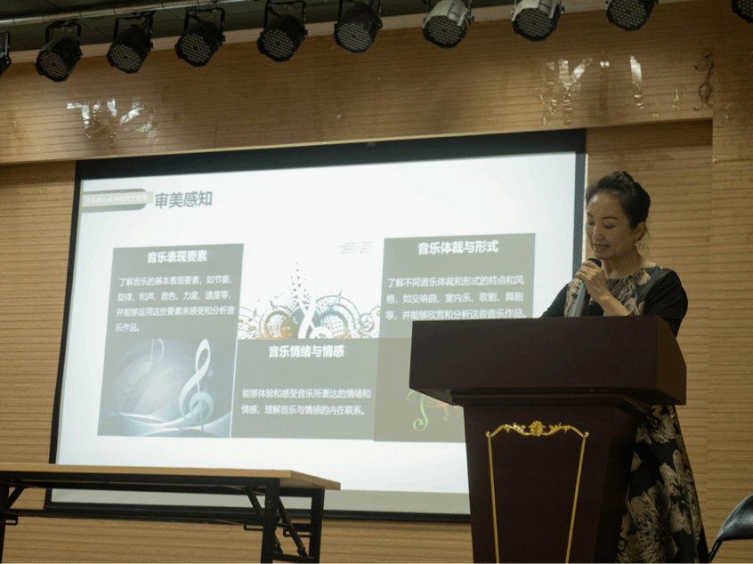 活动开始前,孙琳以“什么样的老师是一名合格的音乐老师?什么样的课是一节好课”两个问题进行破冰,并从中小学音乐教学概述、音乐教师应具备的基本素质、新课改背景下如何备课、如何进行教学设计等方面依次展开。她认为上好一堂课主要聚焦在研读课程目标、用活十个理念、设定三位目标、整合四个核心、突出音乐审美、注重个性发展、借鉴先进教法、形成风格特点等方面。在具体阐述过程中,孙老师以生动的教学案例为例证,深入浅出的讲解使在场师生切实感受到一名合格的音乐教师应具备的教学能力与教学素养。