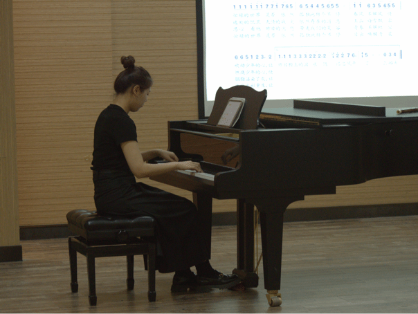 在第二环节的课例展示环节,由我院2021级学生刘小嘉、刘亚菲分别进行唱歌课《明天会更好》、欣赏课《谁不说俺家乡好》的课例展示。两位同学将知识讲授、音乐创编、合唱指挥、体态律动等融入教学中,教学过程完整。展示结束后,孙琳对教学中存在的问题进行细致点评,她建议同学们要重视课程导入环节,并建议要注重课程讲解的逻辑性与感染力,同时还要首尾呼应,在教学中要通过课程思政、以美育人等充实教课堂,提升课堂高度。