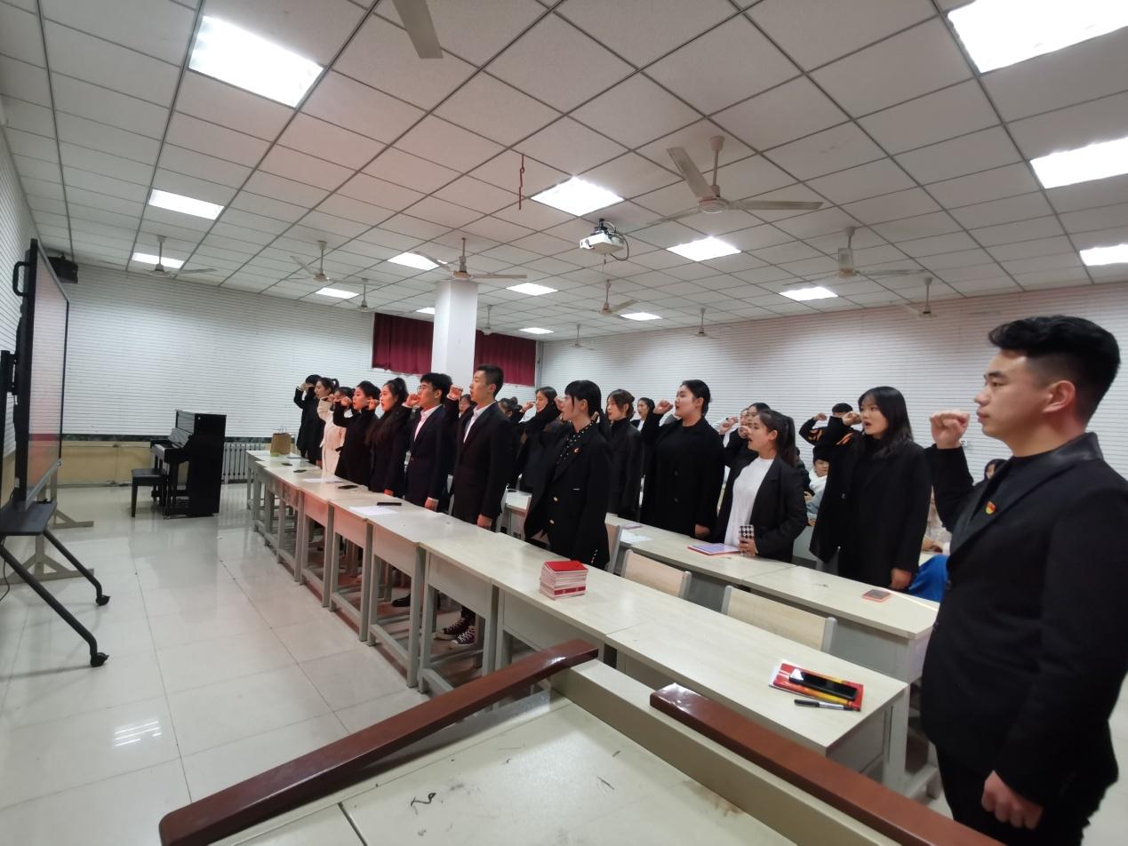 伴着庄严的《国际歌》,入党宣誓仪式正式开始,马媛老师宣布了学院党委对新发展预备党员的审批意见,带领新发展的29名党员在党旗下宣誓,老党员一起重温了入党誓词。