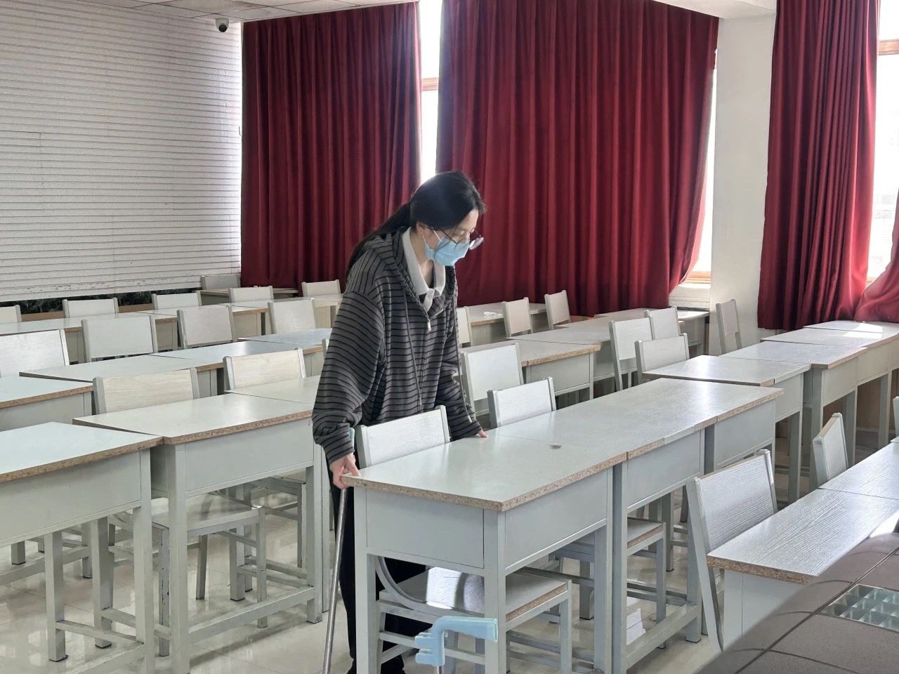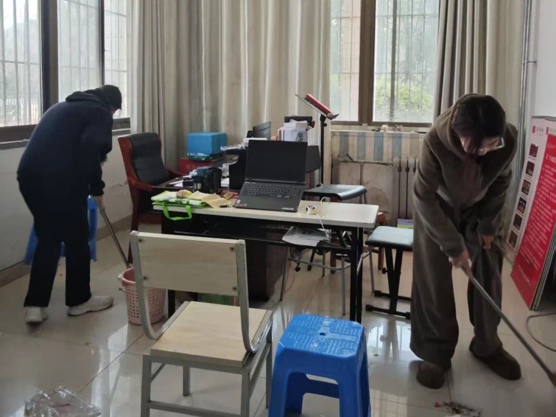 教学场所:学院多媒体教室内,志愿者逐一清理桌洞垃圾,对桌椅进行消毒擦拭;礼堂清洁小组则拖洗地面、整理谱夹与座椅,为后续演出活动提供洁净场地。