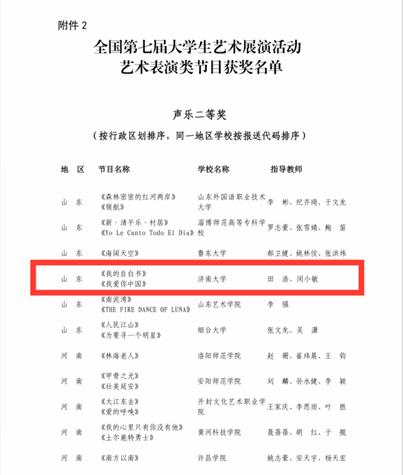 历时半年的全国第七届大学生艺术展演活动近日落幕,教育部办公厅即日公布了获奖结果。在本届艺术展演活动中,由田浩、闵小敏两位老师指导,williamhill英国山东泉城合唱团演绎的合唱作品《我的自白书》、《我爱你中国》代表学校参赛,斩获声乐类二等奖。